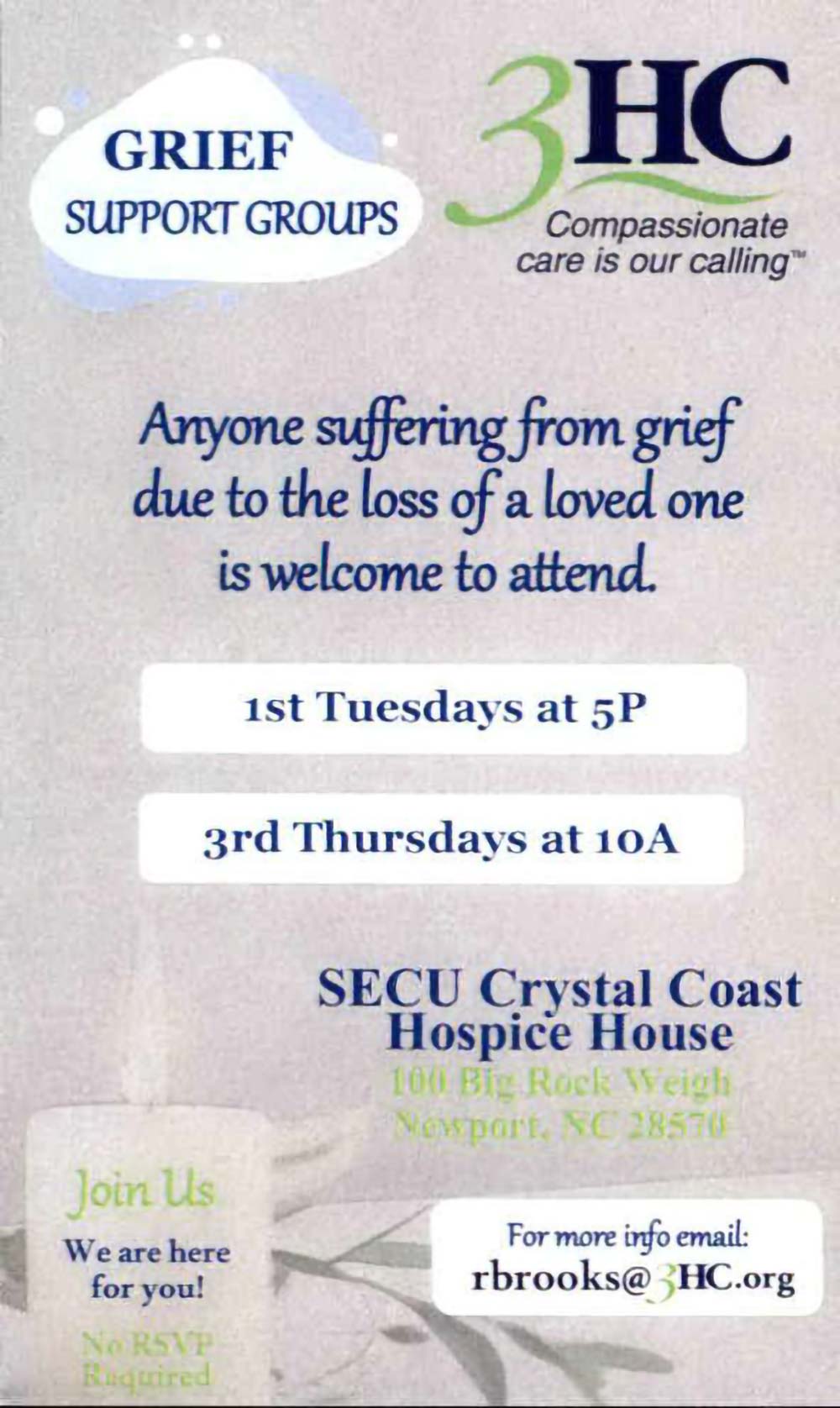 Anyone suffering from grief due to the loss of a loved one is welcome to attend one of our monthly support groups.